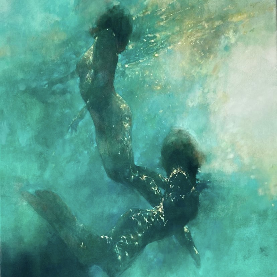 Bill Bate Trained at London’s Central School of Art & has subsequently acquired an international following of collectors. In his underwater scenes refracted light illuminates the human form imbuing it with spirituality & expression.