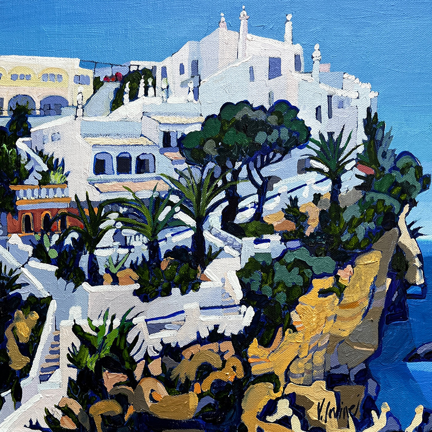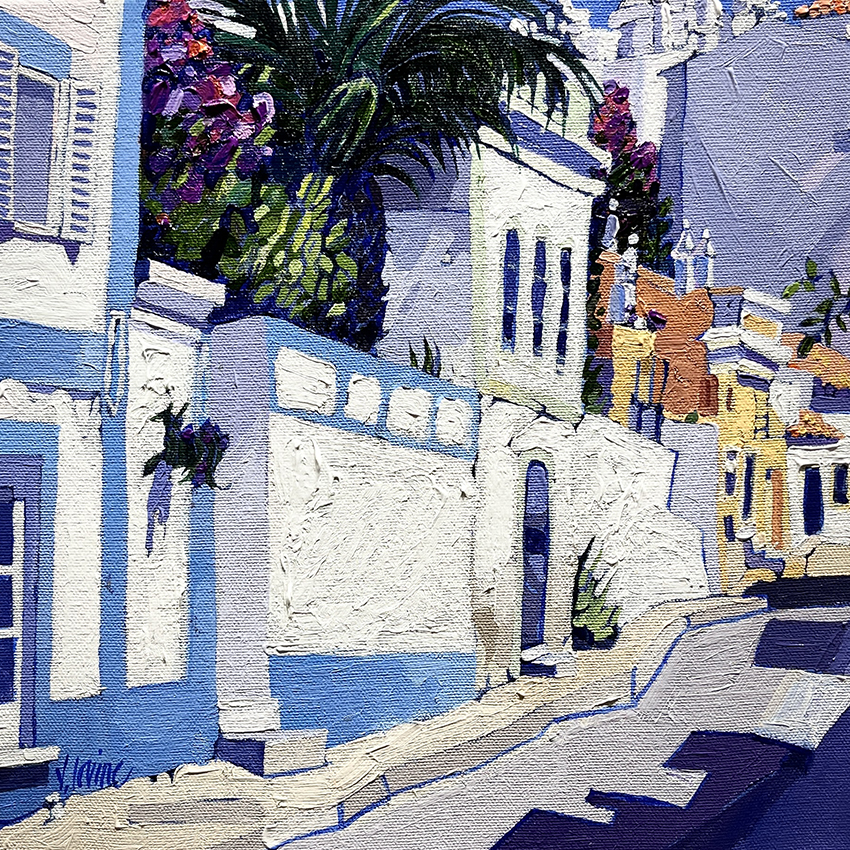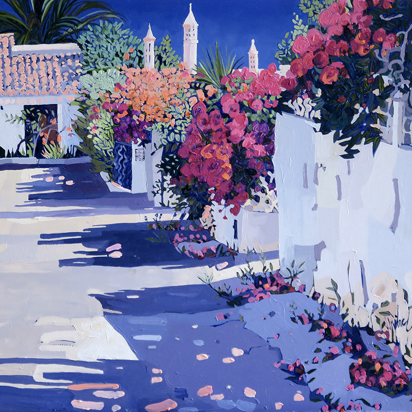 “My paintings tend to fall mainly into the categories of townscape , seascape and still life, although recently the townscapes seem to be dominating. Although they are involved with pattern and shape, I have become increasingly interested in the dramatic use of light and shade and the effects of sunlight on an object, be it on a building or on water, as the Portuguese townscapes. I work from my studio in Glasgow and also spend as much time as possible painting in the Algarve.”
