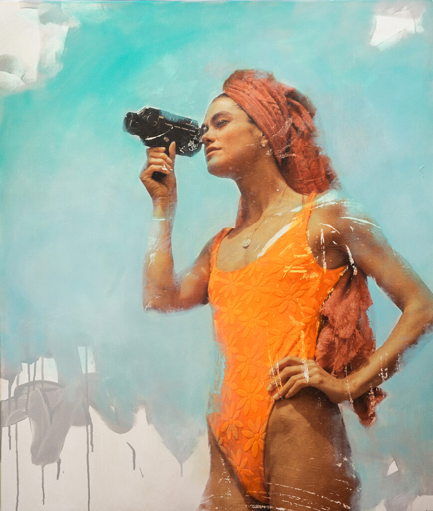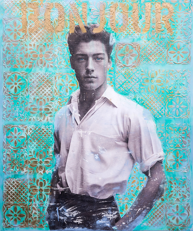 Mari Arp is a German artist who uses the montage technique to give cinema idols a new lease of life. She researches billboards and movie magazines for actresses, models and pin up girls . Her over life size montages combine their flawless appearance with graphic backgrounds and over painting . Additional techniques with the application of acrylic, charcoal and oil pastels . Finally, several coats of veneer for protection and to enhance a lustrous finish,